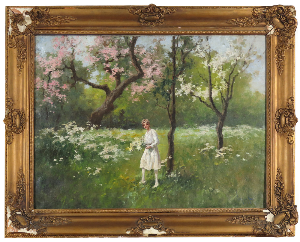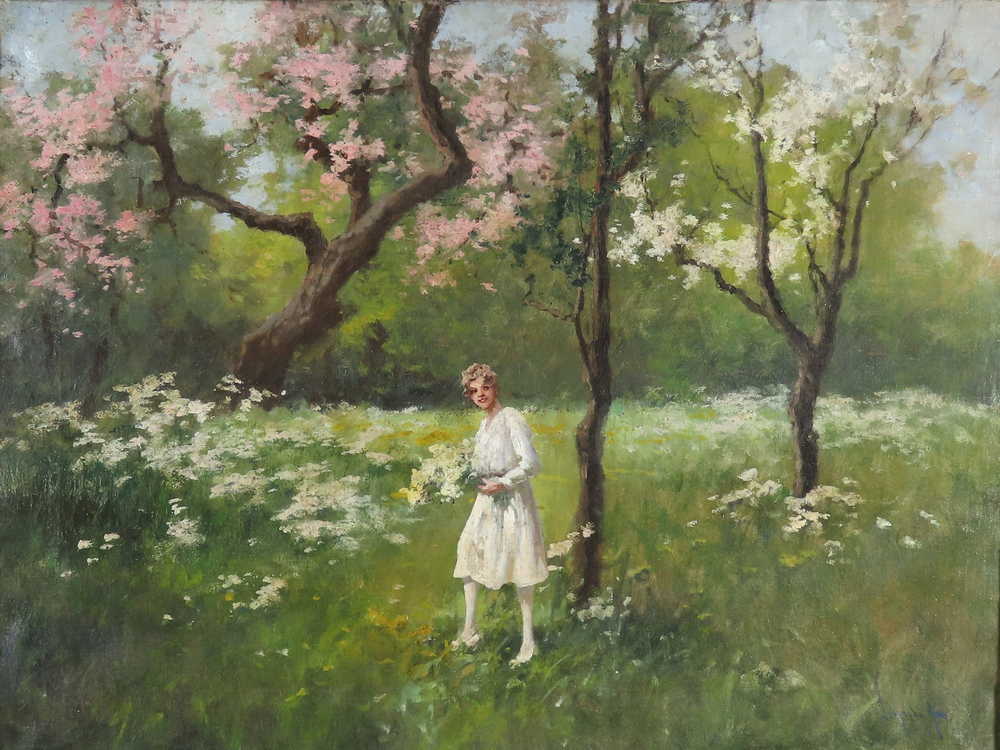 Olejomaľba reprezentuje charakteristický záujem Antala Neográdyho o poetické krajinomaľby s figurálnym motívom. Scéna dievčaťa stojaceho medzi rozkvitnutými stromami kombinuje realistické spracovanie s dekoratívnou farebnou harmóniou, čím reflektuje dobový akademický naturalizmus prelomu 19. a 20. storočia. Autor využíva svetelnosť a jemnú koloristiku na zdôraznenie idylickej atmosféry a estetického pôžitku.