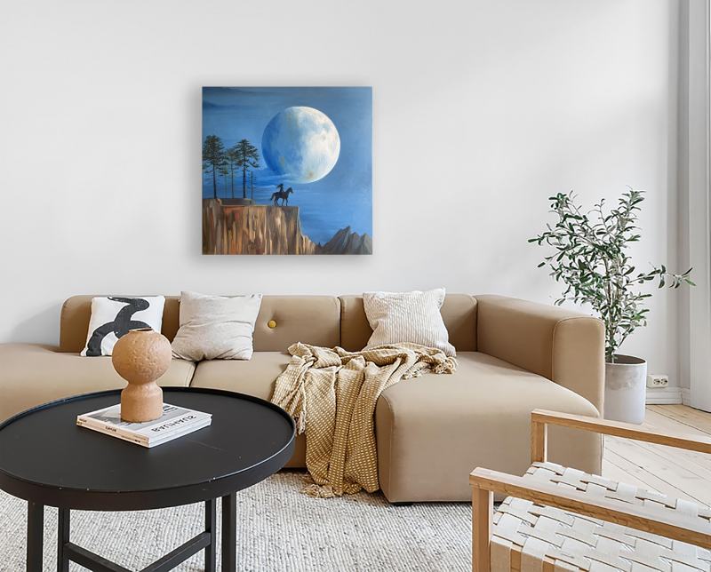 Obraz so zaujímavou scenériou, nadrealistický, s myšlienkou cesty, na ktorú sa Nočná jazdkyňa vybrala. Jej cieľ sa črtá v blízkom horizonte...