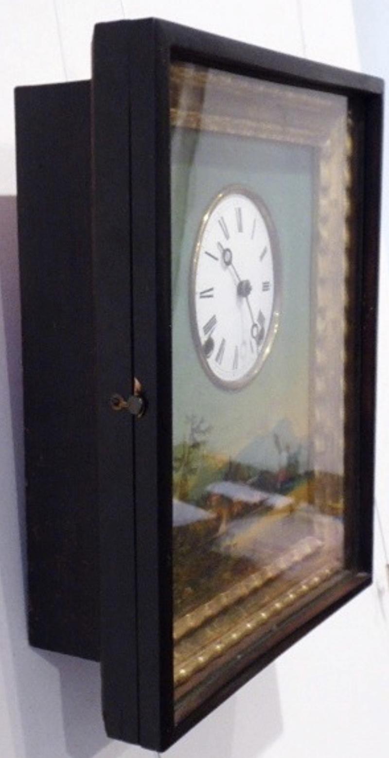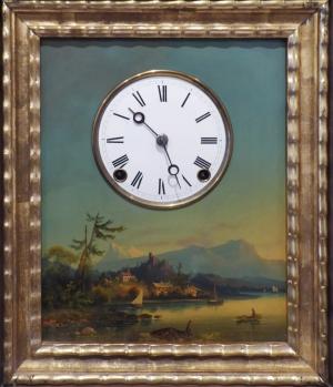 Švédsko, Westervik 1880 - 1910. Dřevo, ruční malba na zinkovém plechu, originální klíč součástí. Období a styl: romantismus. Výška 37,5 cm, šířka 32 cm a hloubka 12 cm. Ručně malované obrazové rámové hodiny v romantickém stylu. Stroj s kotvovým krokem, půlové bití na pružiny. Bílý emailový ciferník s ručně černě malovanými římskými číslicemi. Ocelové modřené hodinové ručičky. Dřevěná skříňka hodin s odklopnými dvířky, zlatým rámem a sklem. Čelní strana dekorovaná ručně malovanou krajinou s plachetnicí, rybářem na loďce a domky s malým kostelíkem pod horskými velikány. Uvnitř hodin originální papírový štítek: Adolf M. Norstedt, Uhrhandel, Optiska Magasin, Westervik. Originální klíč přiložen. Funkční.