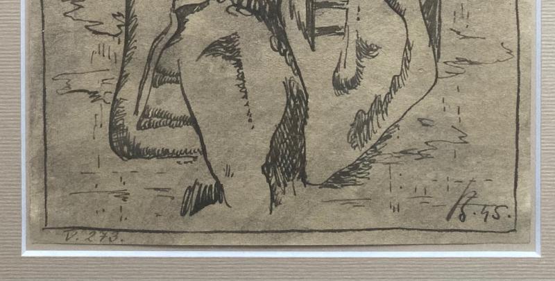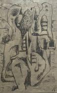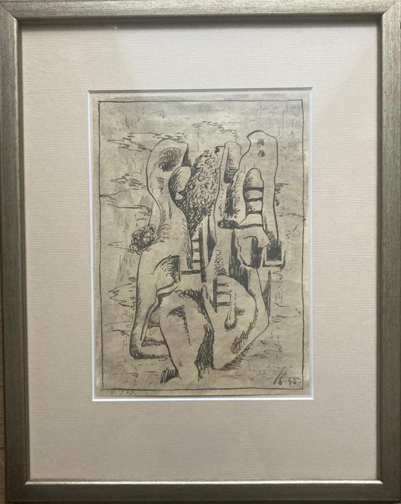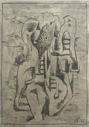 Surealistická kompozícia - 1945, tuš na papieri, vnútorný rozmer kresby 20,5 x 14,5 cm, značené vpravo dole.