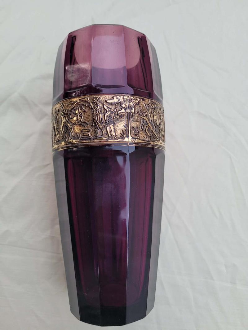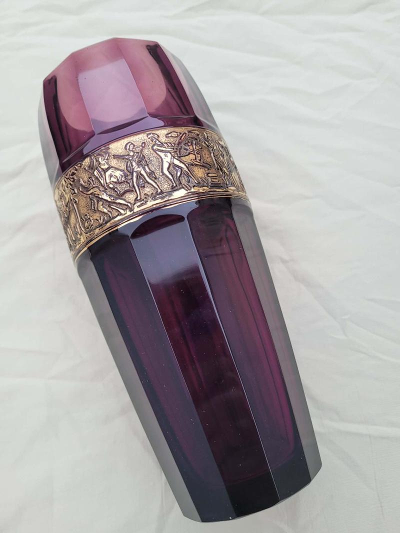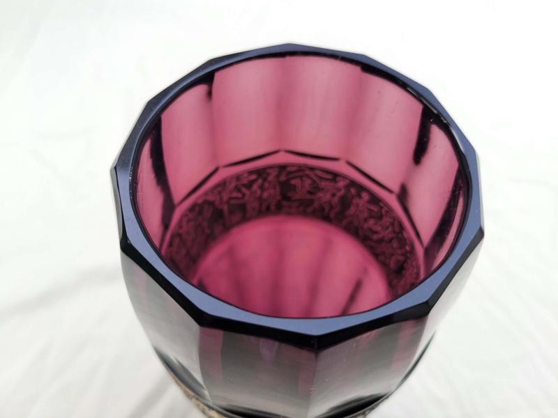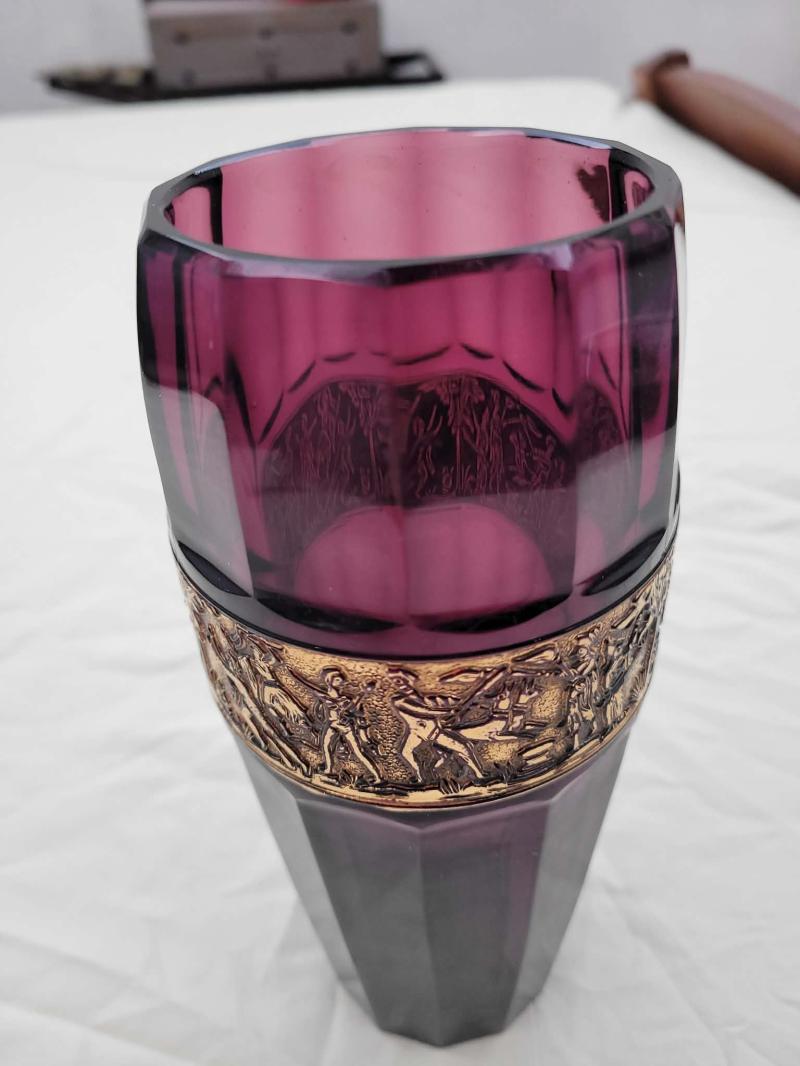Luxusní váza MOSER – ametystové sklo, zlacený reliéf, signováno r. cca1930-1945