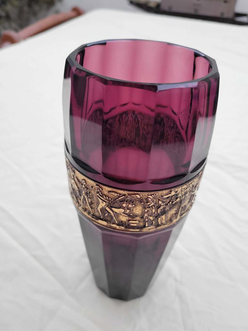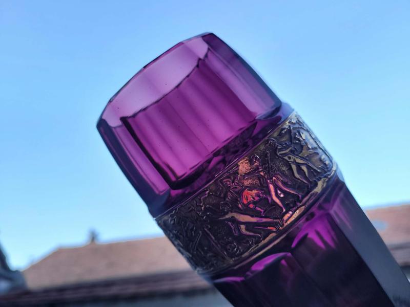Nabízím elegantní broušenou vázu z české sklárny Moser, vyrobenou z hluboce zbarveného ametystového skla. Váza je zdobena bohatým zlaceným reliéfním pásem s figurální scénou, typickým pro luxusní produkci sklárny Moser z období 20. století / pravděpodobně 1930-45/ Sklo je ručně broušené do mnohostěnného tvaru, který krásně láme světlo a zvýrazňuje sytou purpurovou barvu. ✔ signováno Moser na dně ✔ velmi dekorativní a sběratelský kus ✔ české umělecké sklo Stav: velmi dobrý – bez prasklin a oťuků. Místy mírně setřené zlacení odpovídající stáří. Na dně drobné povrchové škrábance od používání. Rozměry: výška: 19,6 cm průměr hrdla: cca 7,5 cm Váza je vhodná jak do sbírky českého skla, tak jako luxusní dekorace interiéru. prodejní místo - Česká Republika, zašlu kurýrem či poštou