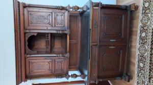 Príborník je zdobený rezbárskou a sústruženou výzdobou. Horná časť je zdobená vyrezávanými dvierkami, po bokoch a v strede zdobená sústruženými stlpikmi. Stredná časť je otvorená, podložená čiernou mramorovou platňou, na ktorej sú sústružené stlpiky. Dolná časť má dva šuplíky a dvojdverový úložný priestor. Nábytok potrebuje drobné opravy a výmenu kovania. Rozmery: výška-215 cm, šírka-150 cm, hĺbka-70 cm.