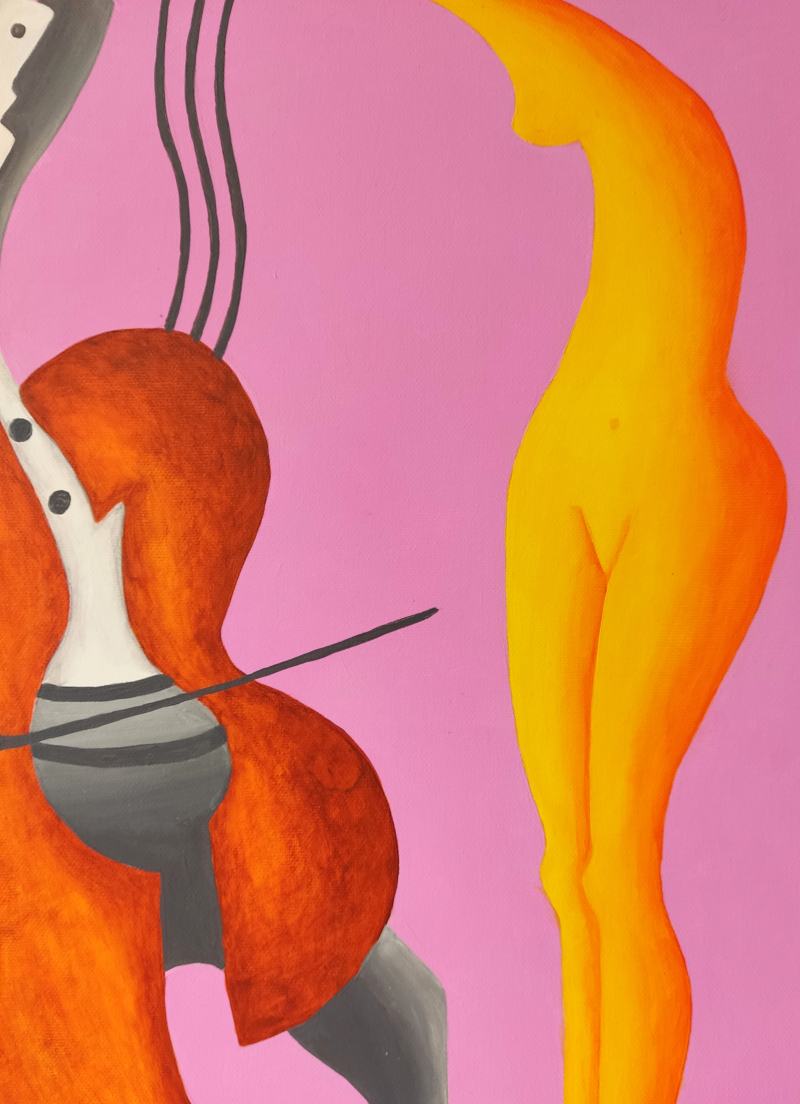 Priestor okolo postáv som zámerne dotvoril jednoduchými farbami, čo symbolizuje nielen čistotu a nepoškvrnenosť vzťahu medzi postavami na plátne, ale aj ich intimitu izolovanú od akýchkoľvek rušivých vplyvov prostredia.