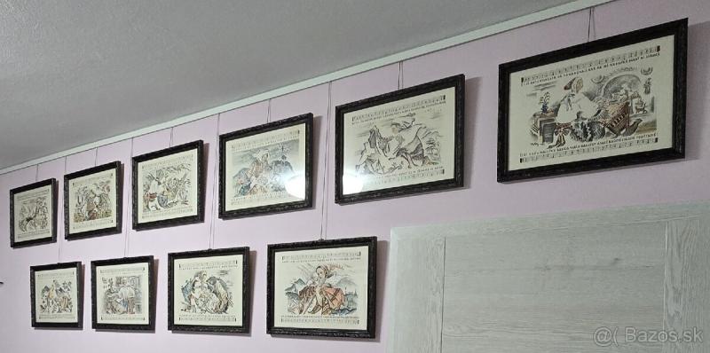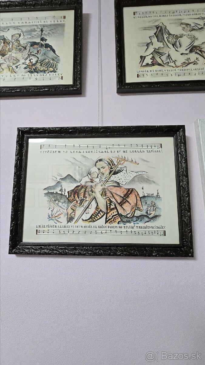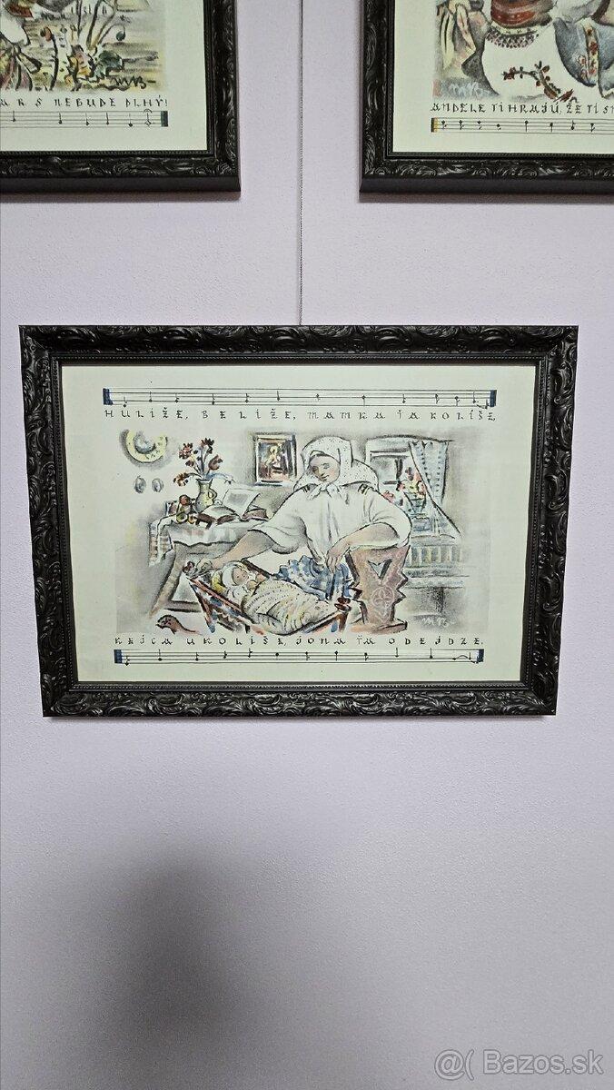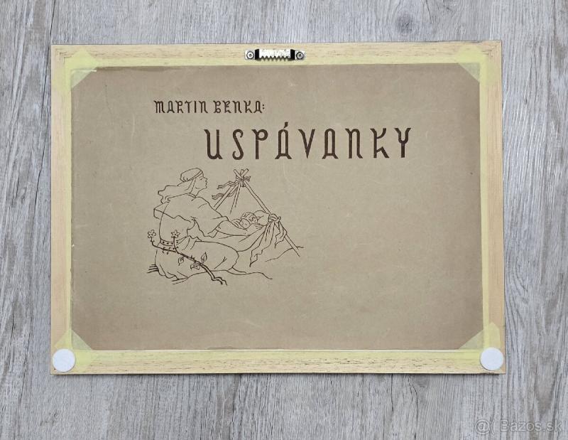 Zarámovaný kompletný ciklus 10 farebných litografických listov Martina Benku s témou matky a dieťaťa. /1946/ Jedna z najvzácnejších "benkovských" tlačí. Notová časť Karol Plicka. Originál obal zachovaný v zadu na jednom z rámov. Drevený rám s archivačným sklom ARTGLASS UV99