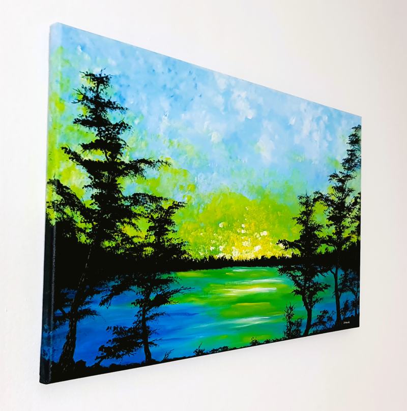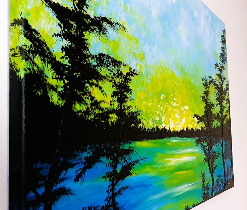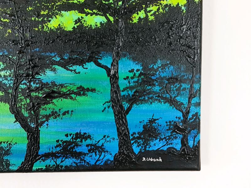 Živými akrylovými ťahmi som zachytil pokojnú žiaru súmraku a miešal som impresionistické odtiene, aby som evokoval pokoj a nádej. Toto dielo vyžaruje jemnú energiu premeny prírody a pozýva do vášho priestoru pokojné zamyslenie a teplo. Je to moment, keď svetlo a tieň tancujú, inšpirujú pokoj a spojenie s prírodným svetom. Akryl na plátne. Maľované aj cez 2cm okraje plátna.