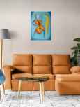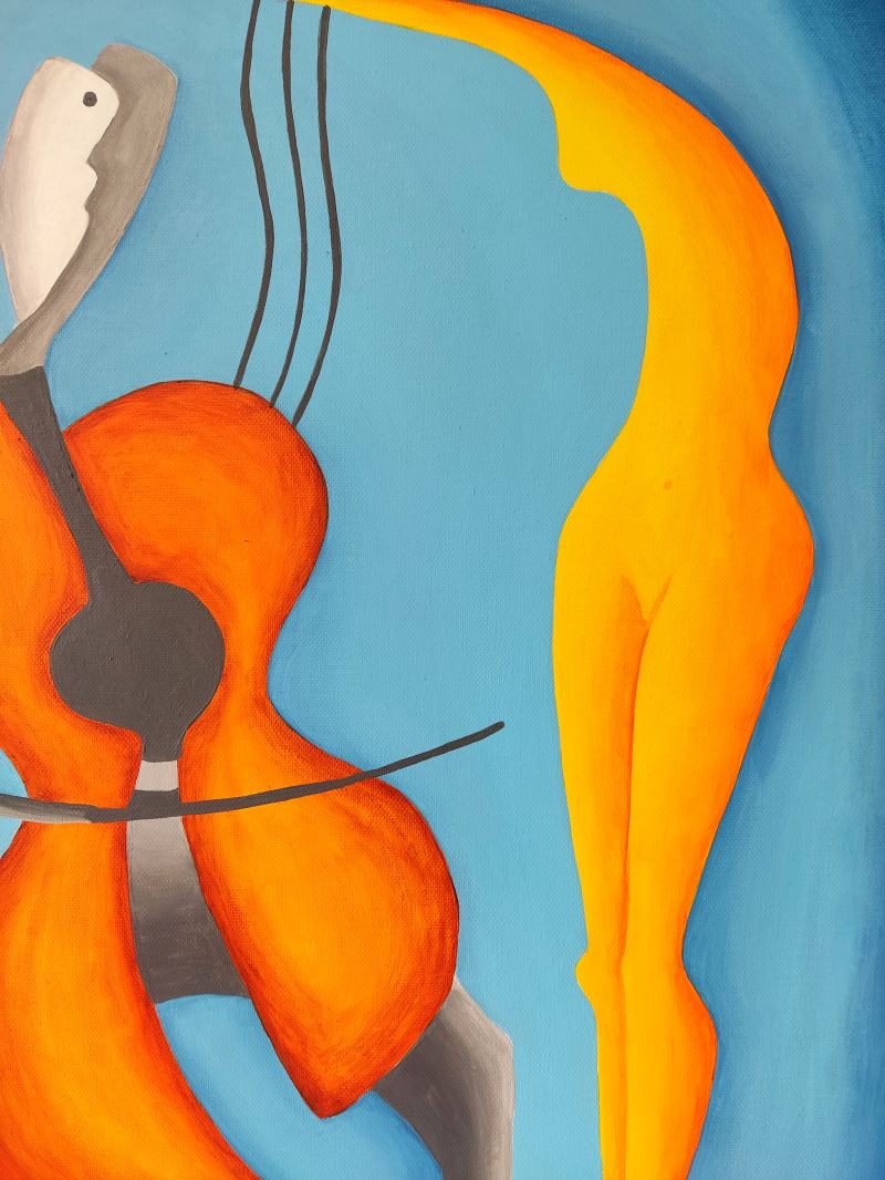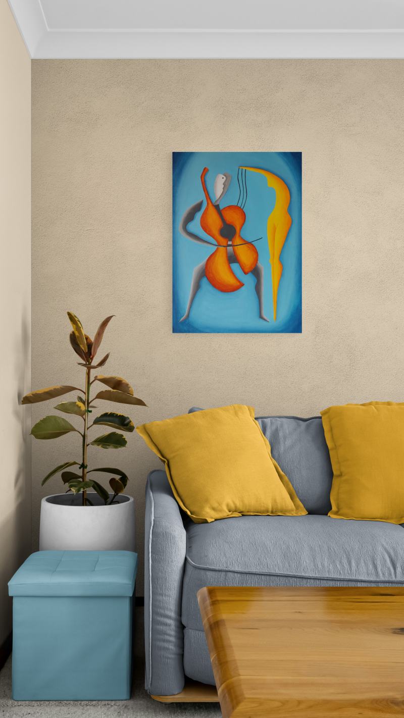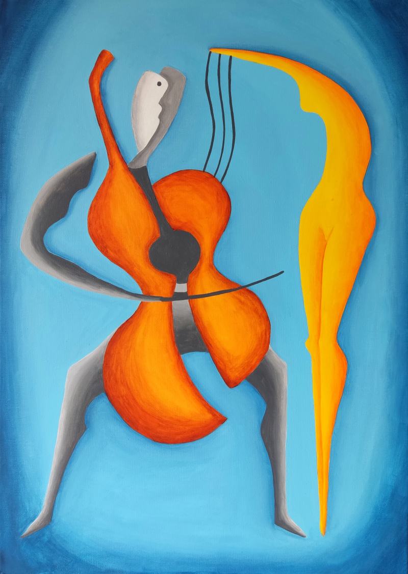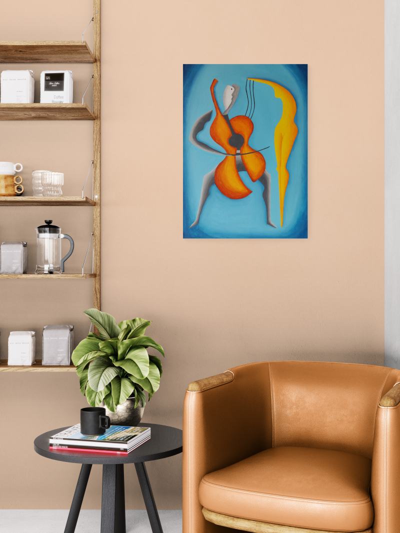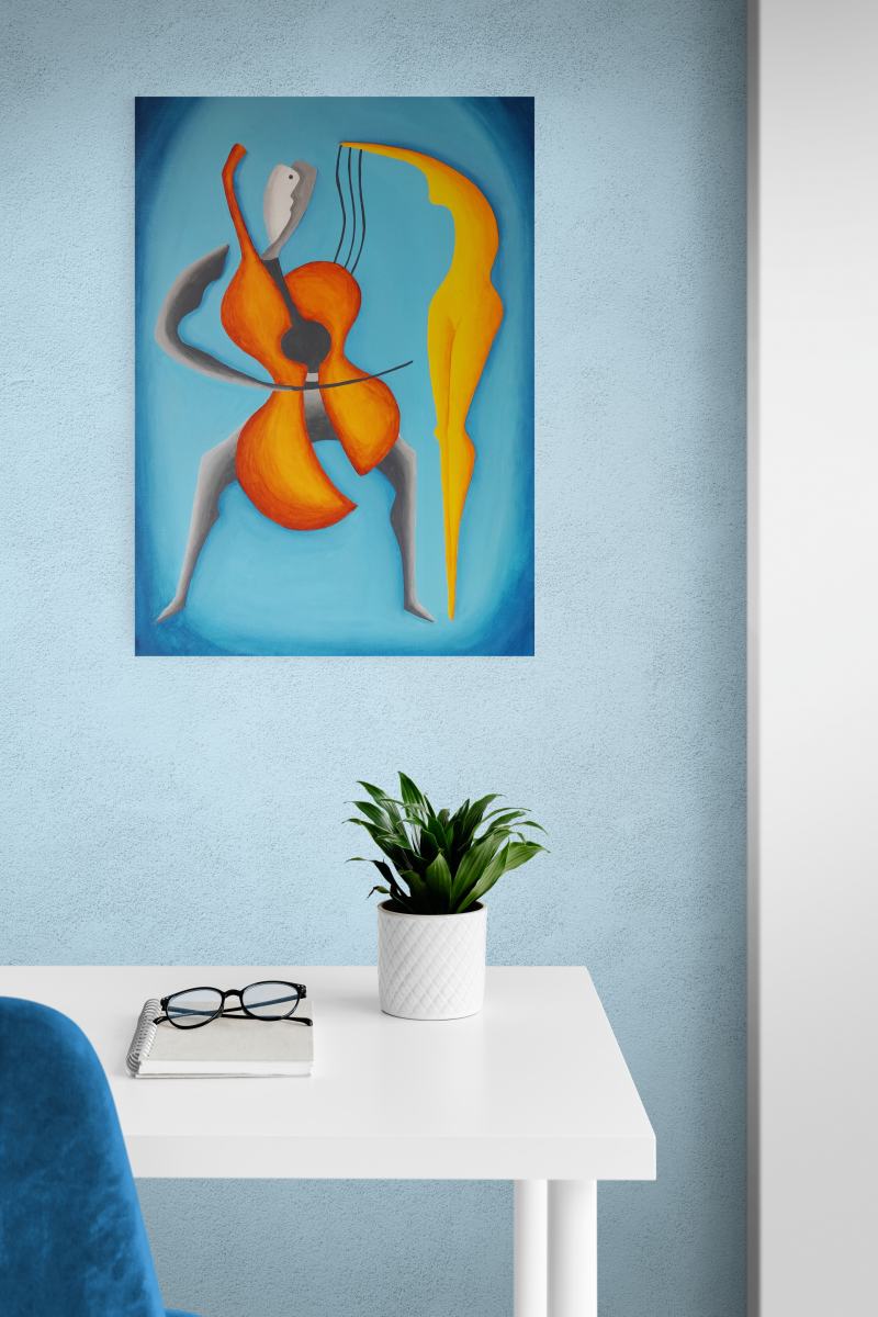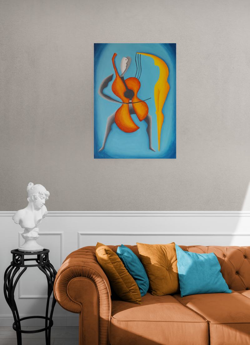 Kompozíciu tohto obrazu som vytvoril tak, aby jeho hlavná myšlienka bola pre diváka jasne zrejmá – óda na partnerskú lásku medzi ženou a mužom. Na prvý pohľad obe postavy vyžarujú pokoj, pokoj, harmóniu, dôstojnosť, symbiózu, súdržnosť, vážnosť, rozvahu, pokoru, úctu, citovú blízkosť, porozumenie, ladnosť, rozvážnosť a stabilitu. Napriek tomu, že každá z dvojice je samostatnou individualitou, divák veľmi jasne vníma, že vytvárajú vzájomne prepojenú a príbuznú kompatibilnú dvojicu naladenú na rovnakú tóninu. Ich prepojenie je symbolicky umocnené ladným naklonením časti tela ženy smerom k partnerovi, ako aj vlasmi padajúcimi na mužove ramená. Priestor okolo postáv som zámerne dotvoril jednoduchými farbami, čo symbolizuje nielen čistotu a nepoškvrnenosť vzťahu medzi postavami na plátne, ale aj ich intimitu izolovanú od akýchkoľvek rušivých vplyvov prostredia. Obraz je vhodný do interiérov ľudí, pre ktorých je partnerská láska dôležitým aspektom ich života a chcú ju naďalej rozvíjať. Samozrejme, je perfektný ako darček, prejav pozornosti vášmu partnerovi.