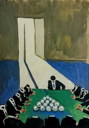 Dielo s názvom Meeting pôsobí ako silná metafora mocenských hier, manipulácie a odľudštenia v kolektívnych rozhodovacích procesoch. Symbolika jednotlivých prvkov odkrýva hlbšiu vrstvu významov, ktorá naznačuje mechanizmy moci a zodpovednosti.