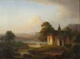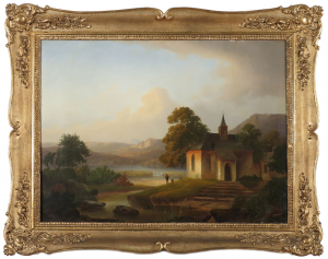 Názov diela: Krajina s kaplnkou pri rieke Technika: olej na plátne Rok: 1846 Značenie: vpravo dole Rozmery: 47 x 63 cm, s rámom: 62,5 x 79 cm
