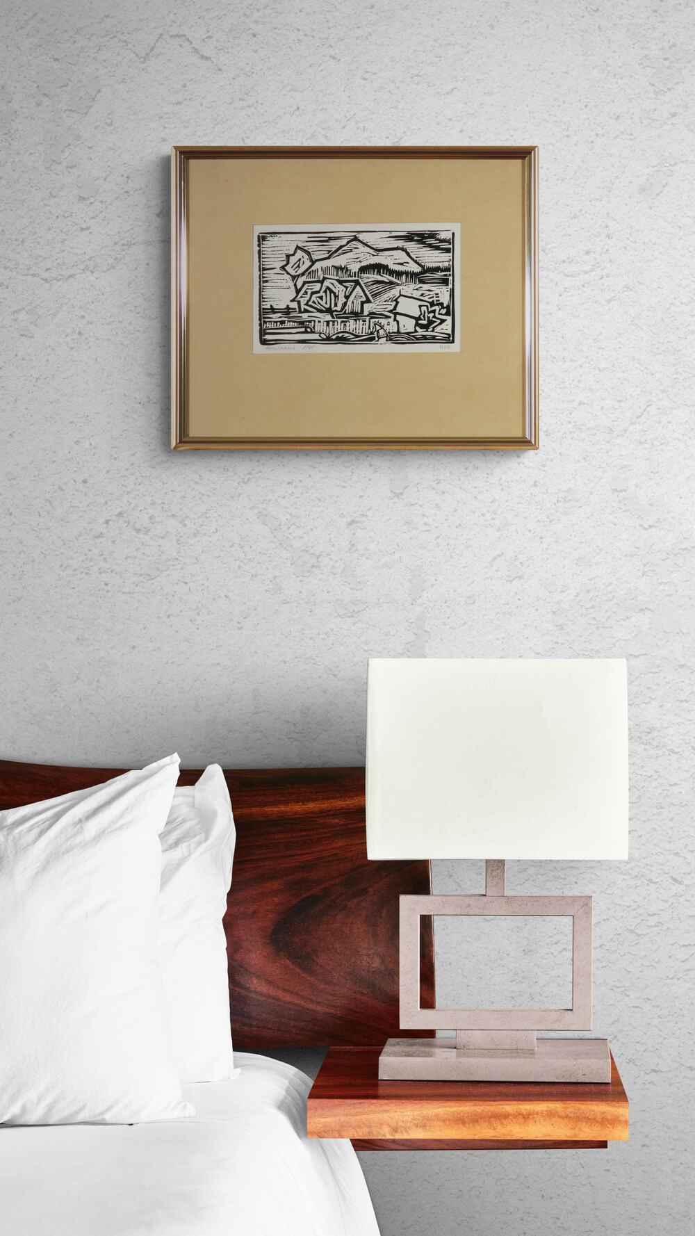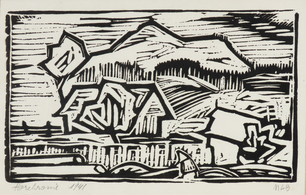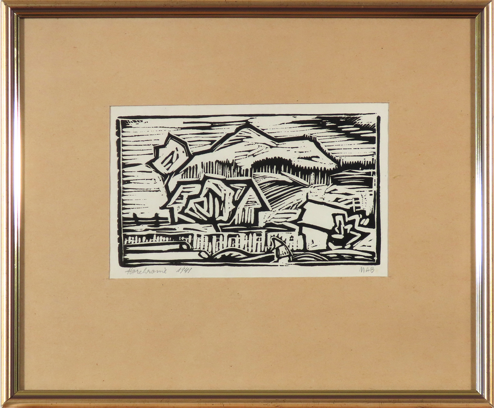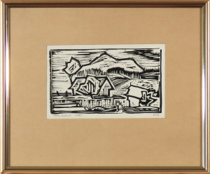 34 000 € - Krajina s kostolíkom, sýpkou a člnom.. Okolo 1951-54. Olej na kartóne. 26 x 41 cm.