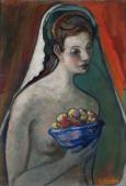 Obraz zaujme aj veľmi vyváženým koloritom, v ktorom sa hlboké zeleno-modré tóny pozadia prelínajú s teplou modeláciou pleti a výraznou farebnosťou objektu v popredí. Ide o zberateľsky atraktívnu prácu, ktorá dobre reprezentuje autorov osobitý mierne symbolizujúci štýl.
