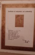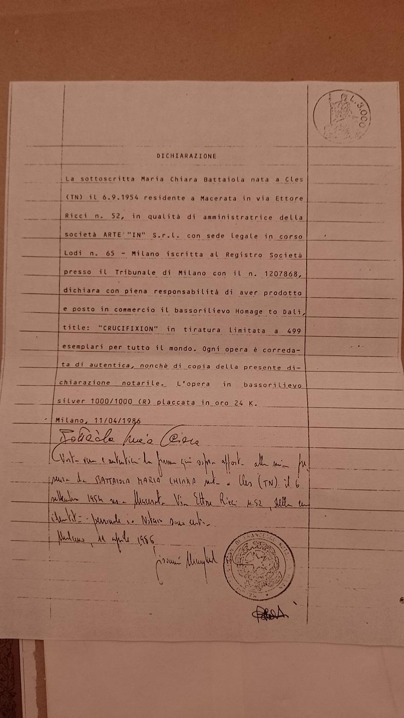 Dielo je certifikované - certifikát autenticity vydaný La Nonna Arte, Sesto S.Giovanni a čestné vyhlásenie editorky diela menom Maria Chiara Battaiola zo dňa 11.4.1986 v Miláne, podľa ktorého bol basreliéf vydaný v limitovanom náklade 499 exemplárov (silver 1000/1000 (R) pozlátené 24K zlatom.