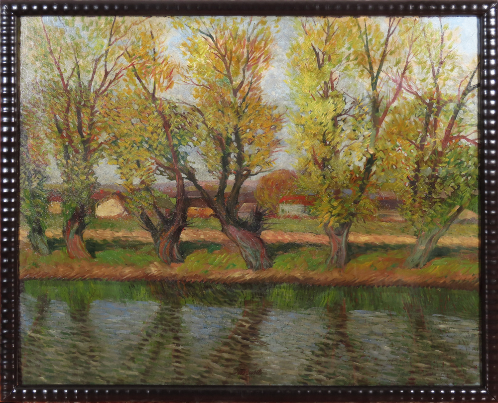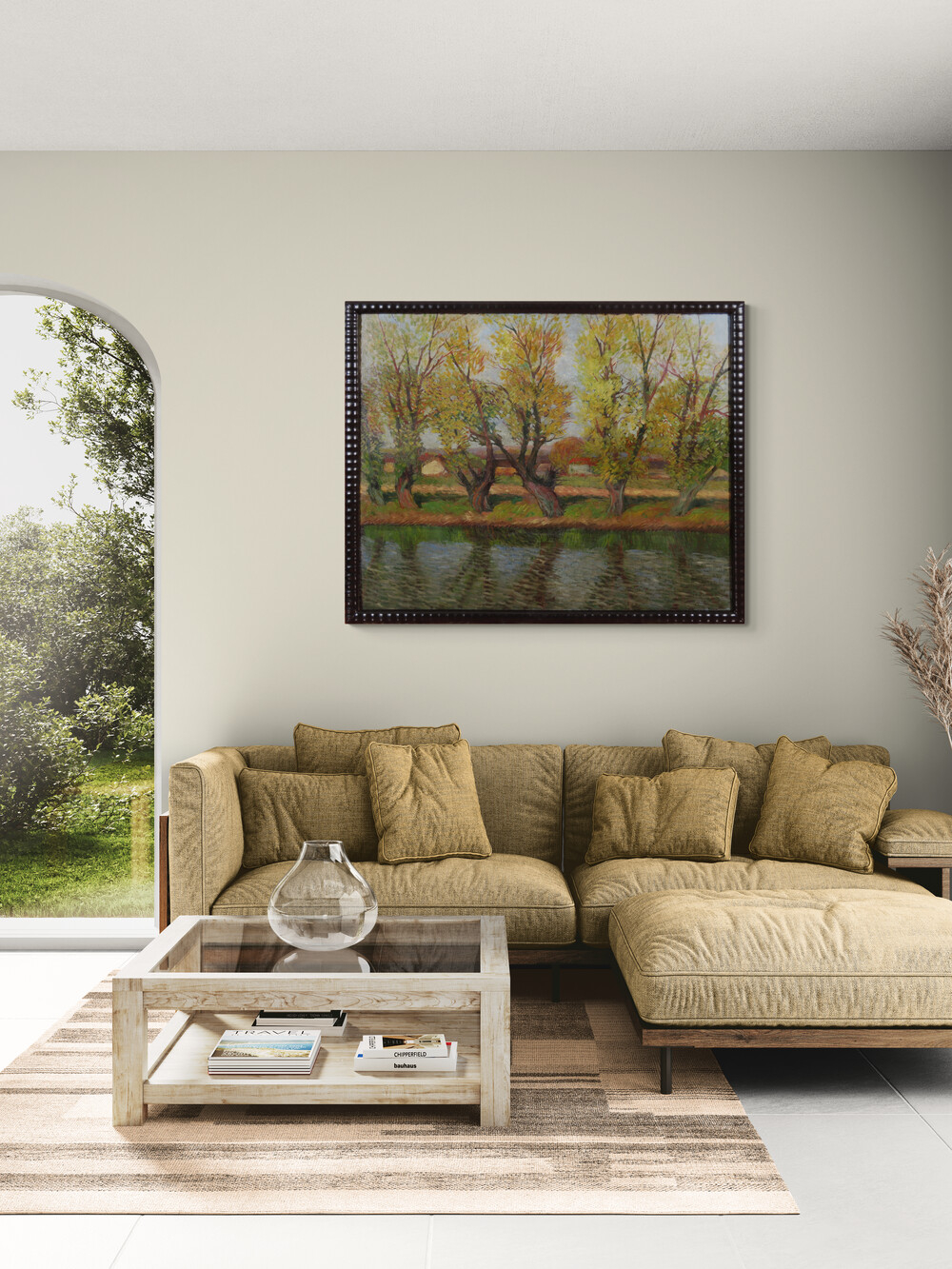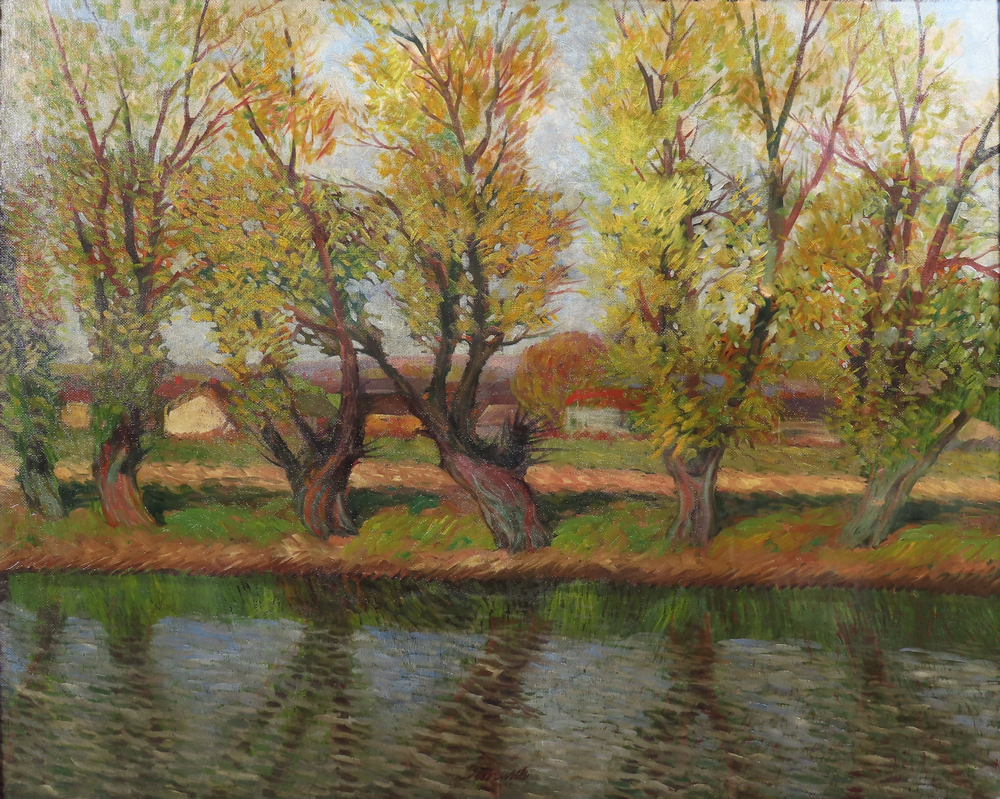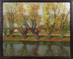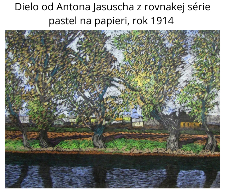 Dielo „Pri rieke“ predstavuje maliarovu introspektívnu meditáciu nad krajinou, ktorá bola pre Antona Jasuscha celoživotným zdrojom inšpirácie. V tejto kompozícii dominuje rad majestátnych stromov s bohato prefarbeným lístím, lemujúcich breh rieky. Ich kmene sa rytmicky opakujú, čím vytvárajú dynamický, takmer hudobný rytmus. Povrch rieky odráža farebnú harmóniu zelene, žltej a okrovej, pričom voda slúži ako zrkadlo svetla a pohybu. Jasusch tu spája realistické pozorovanie prírody s jemnou expresívnosťou maliarskeho rukopisu. Charakteristická je jeho pastózna, nervná maľba, ktorá modeluje svetlo v hustých vrstvách farby. Dielo dýcha pokojom neskorej jesene, no zároveň v sebe nesie vnútorné napätie – dialóg medzi trvácnosťou krajiny a plynutím času. Obraz „Pri rieke“ patrí k výnimočným ukážkam Jasuschovej krajinárskej tvorby, v ktorej sa maliar vzdialil od monumentálnych filozofických vízií a obrátil sa k intímnemu prežívaniu slovenskej prírody.