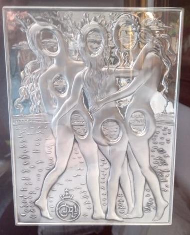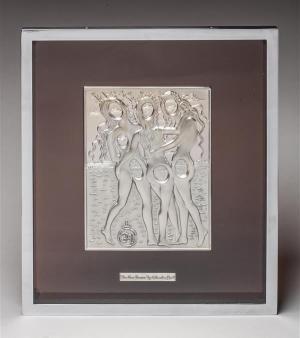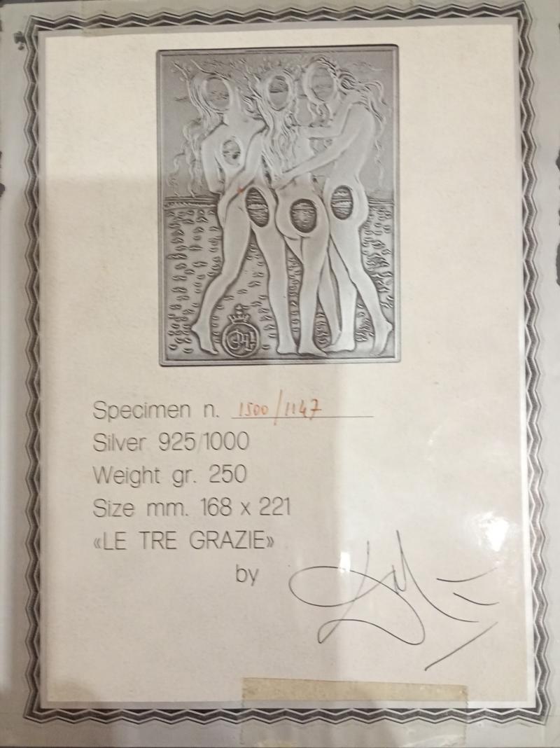 Salvador Dali - Bas relief - striebro - 925/1000 - 250 gr ,názov : Le Tre Grazie / Tri Grácie - 1977 - rozmer 22,2 × 16,8 cm - rozmer s rámom 38cm x 33cm - Výborny stav .... V roku 1976 Mario Pizzorni, sberateľ a prezident venezuelské mincovne Italcambio podpísal zmluvu so Salvadorom Dalím na výrobu 15 akvarelov, ktoré potom boly upravené do basreliéfov, do stríebrného plátu a bronzu.