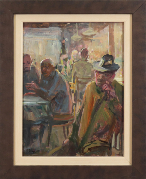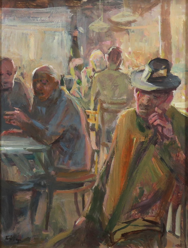 Žánrová scéna zachytáva moment rozhovoru v prostredí tradičnej krčmy. Autor využíva expresívny maliarsky jazyk a kontrastnú farebnosť, ktoré umocňujú atmosféru sociálneho stretnutia.
