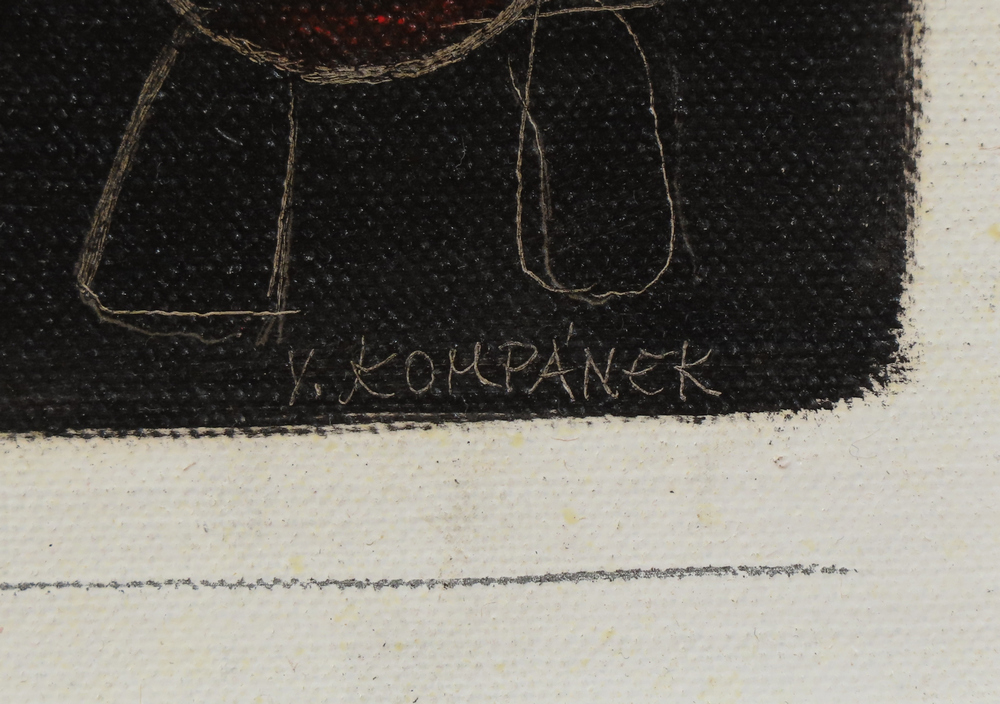 Vladimír Kompánek sa narodil 28. 10. 1927 v Rajci. Zomrel 20.1.2011 v Bratislave. V rokoch1939-47 študoval na žilinskom gymnáziu, prvé výtvarné poučenia od profesora gymnázia, sochára S. Bíroša. 1947-49 študoval na Oddelení kreslenia a maľovania SVŠT v Bratislave (prof. G. Mallý, J. Mudroch, K. Sokol). 1949-54 študoval na Vysokej škole výtvarných umení v Bratislave (prof. Jozef Kostka). 1956 prvé drobné plastiky vidieckych žien. 1957 spoluzakladateľ Skupiny Mikuláša Galandu. 1960 začína striedavo žiť v Bratislave a Rajci. 1964 účasť na XXXII. Bienále v Benátkach. 1961-62 prvé drevené skulptúry. 1965-66 prvé znakové gvašové kresby. 1967 cena G. Herdera vo Viedni. Účasť na EXPO 67 Montreal. 1969 drevené sochy pre EXPO ´70 v Osake, prvé drevené zvieratká a hračky. 1973 začína sústavnejšie maľovať. 1972 pozastavené členstvo v ZSVU. 1974 mytologická tematika Turoňa v maľbe i plastike. 1977-80 v maľbe séria zím, opätovné prijatie do ZSVU. 1982 v maľbe motív krásky a zvieraťa, drevené penáty a poľné znaky v soche a kresbe. 1990-93 drevené sochy veľkých rozmerov skladané z rozlične morených drevených dosiek. Z literatúry: Plevza, V.: Vladimír Kompánek. Bratislava 1988; Rusinová, Z., Kubíková, K.: Vladimír Kompánek - sochy, kresby. Katalóg SNG, Bratislava 1993.