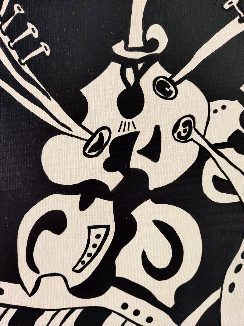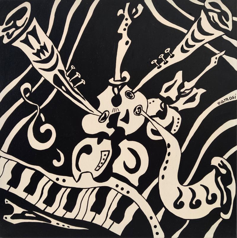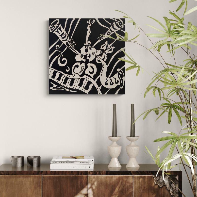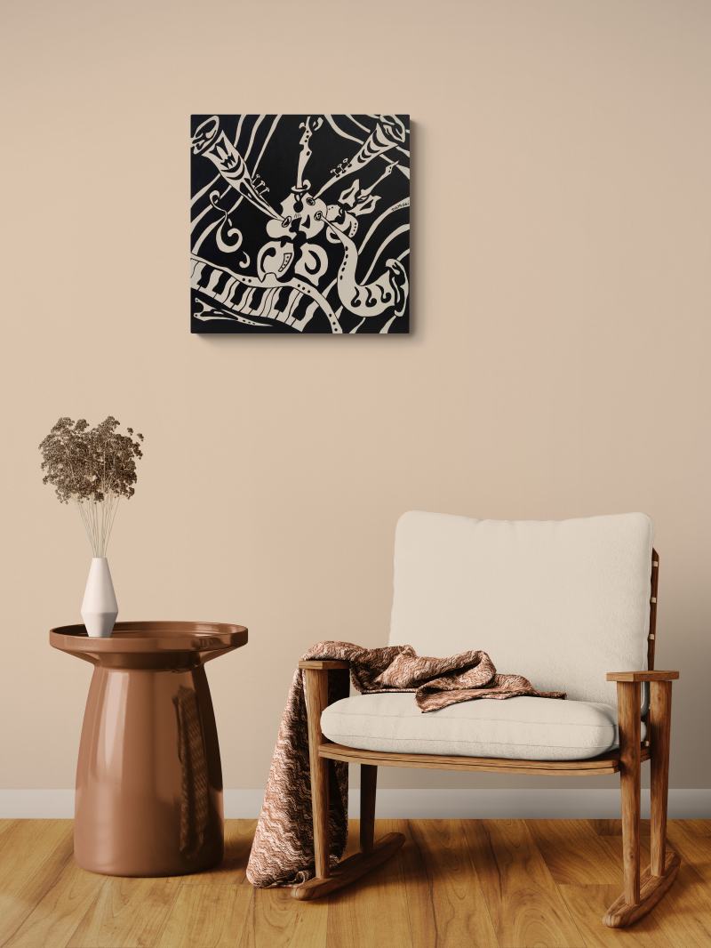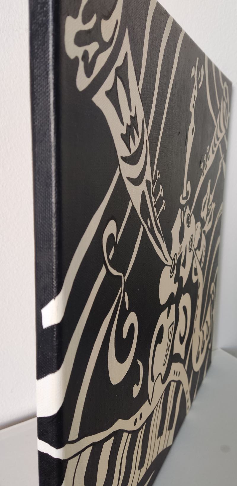 Geometrický poloabstraktný hudobný obraz v štýle pop art inšpirovaný vlastnou fantáziou. Maľba zobrazuje rôzne hudobné nástroje v modernej podobe, ktoré vyjadrujú bláznivé tóny. Zo zaoblených línií predmetov na plátne môžete cítiť prúdenie pozitívnej energie a vibrácií. Maľba pokračuje aj po stranách napnutého plátna (3D efekt) a preto nie je potrebné ju rámovať. Obraz je vhodný nielen pre milovníkov hudby, ale aj pre všetkých, ktorí majú radi decentnú harmóniu.